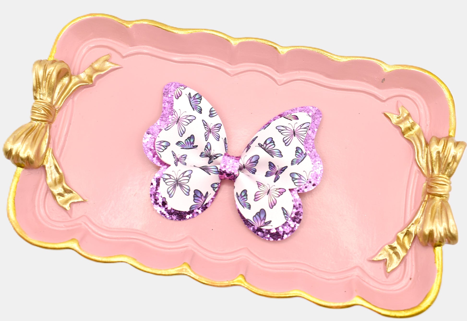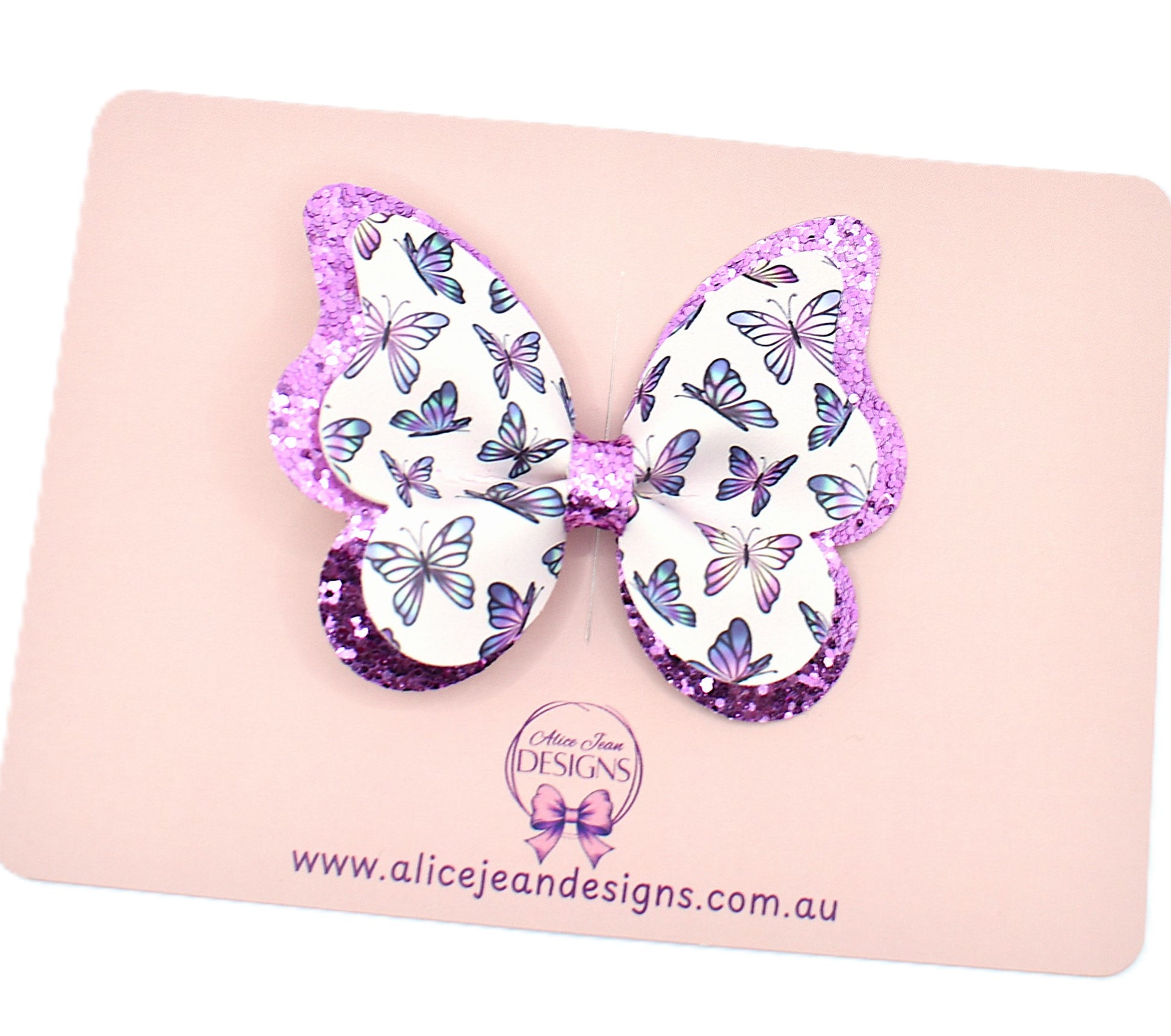 This pretty butterfly clip is made from a pinky/purple glitter and a pink butterfly print faux leather fabric.