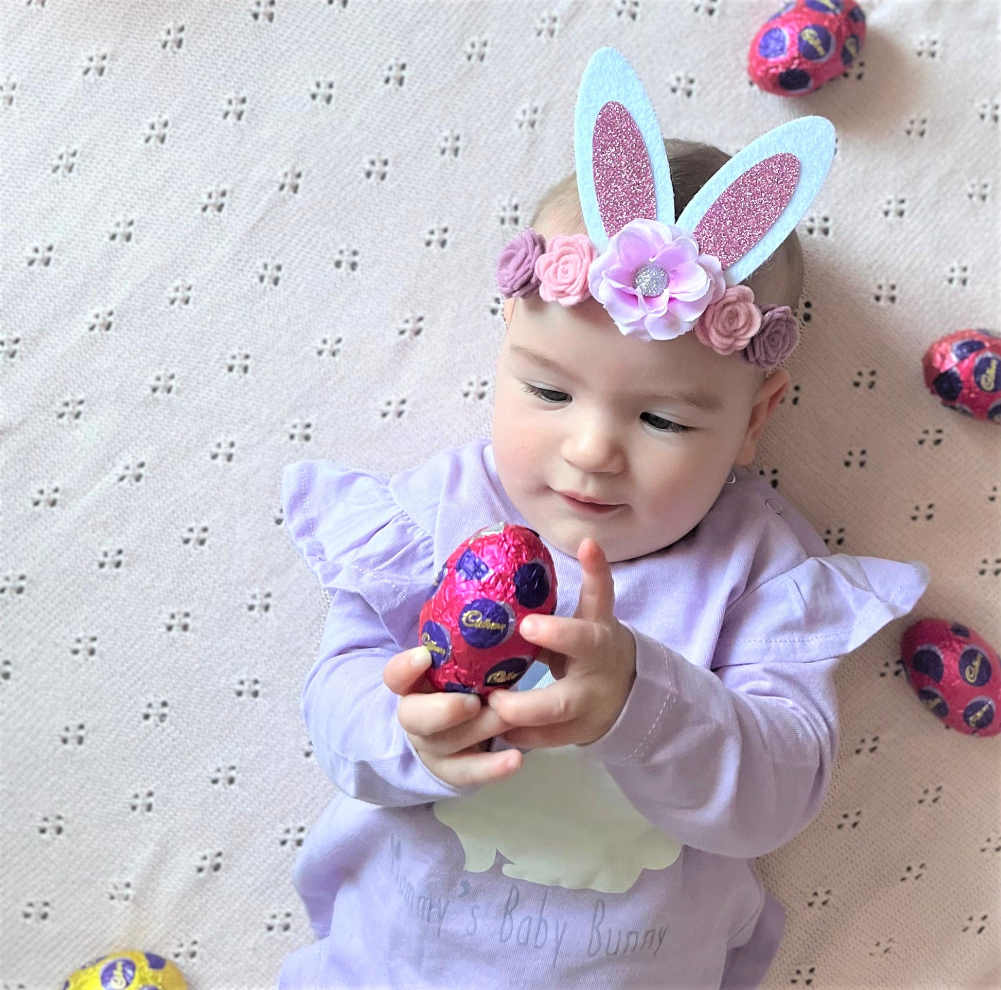 Baby wearing a bunny ears headband and a purple bunny top, surrounded by Easter eggs on a pink blanket