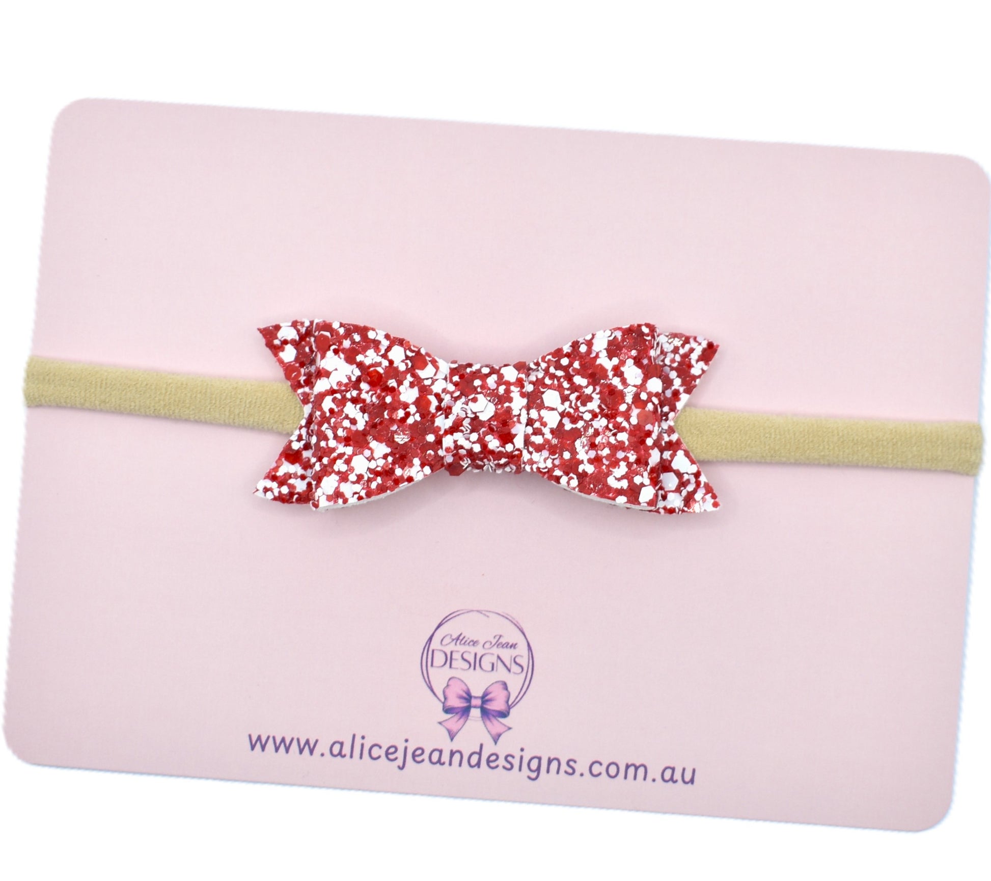 This beautiful Christmas bow is made out of sparkly chunky glitter fabric and measures approx. 7cm wide and 2.7cm high. The red & white glitter reminds me of crushed candy canes!